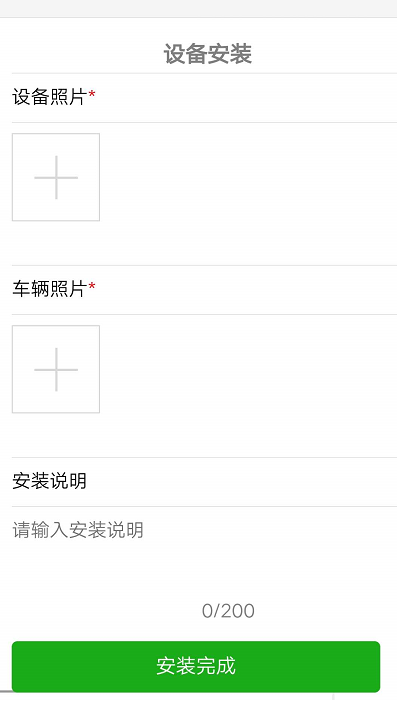 3、点击安装,上传设备及车辆照片,输入安装说明,点击安装完成。