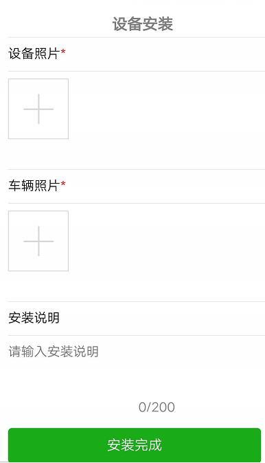 3、点击安装,上传设备及车辆照片,输入安装说明,点击安装完成。